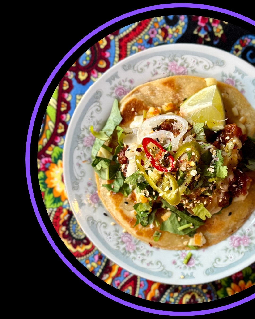 FRITERAT MAJSTORTILLA MED HALSTRAD PILGRIMSMUSSLA, GUACAMOLE, MANGO- & CHILIJAM, LÖKKRISP.